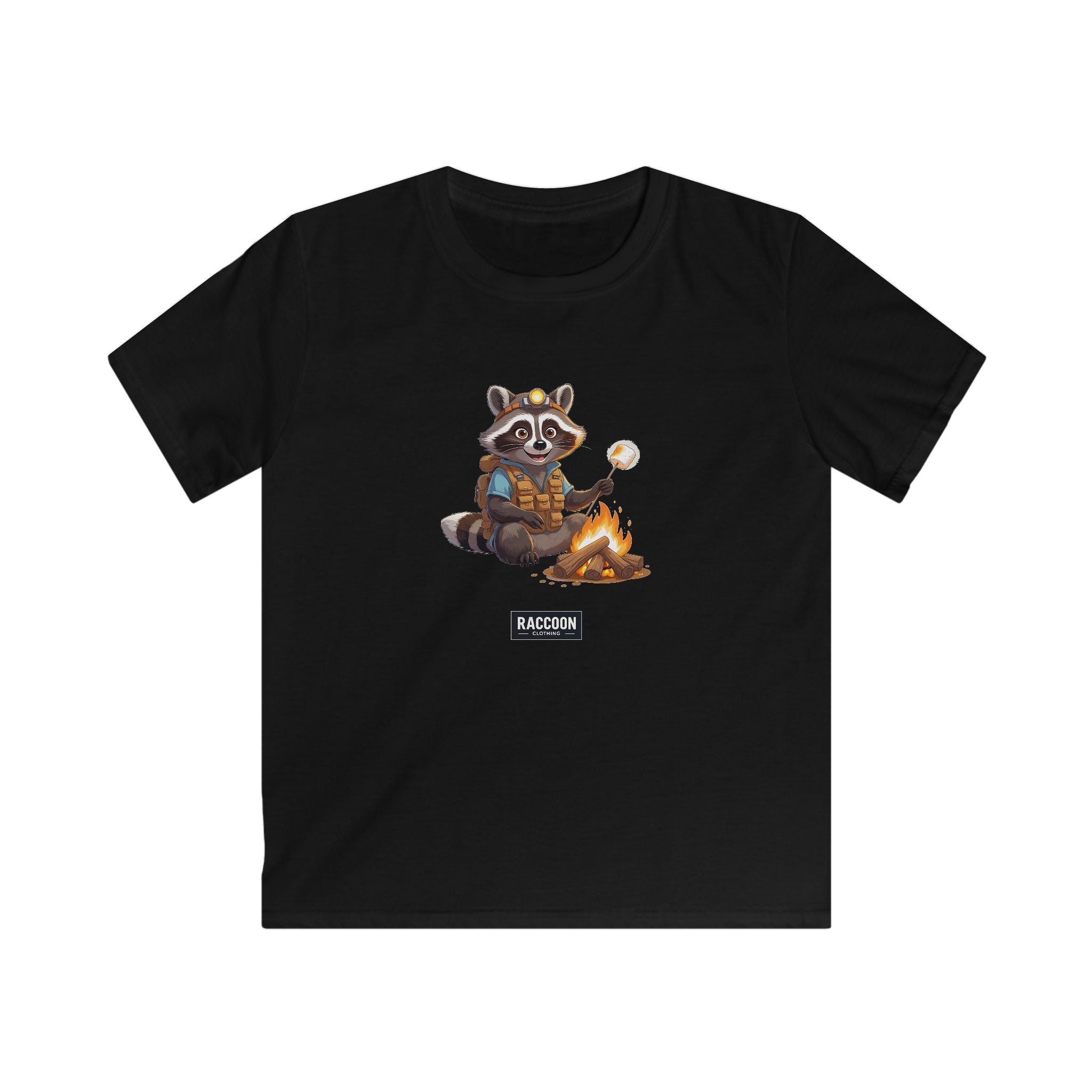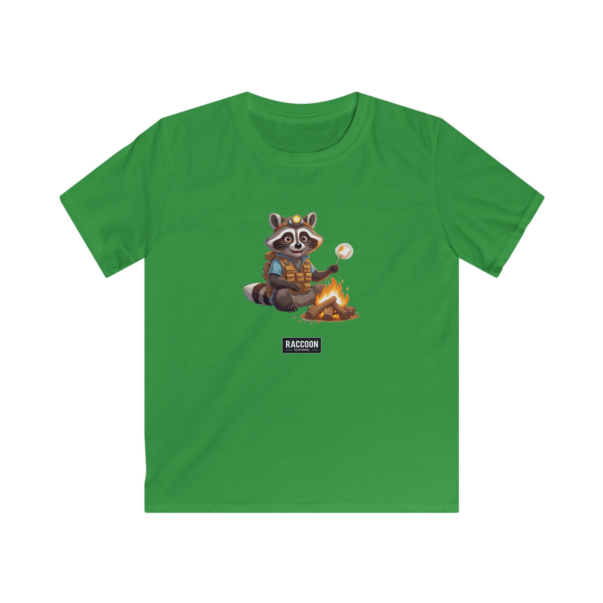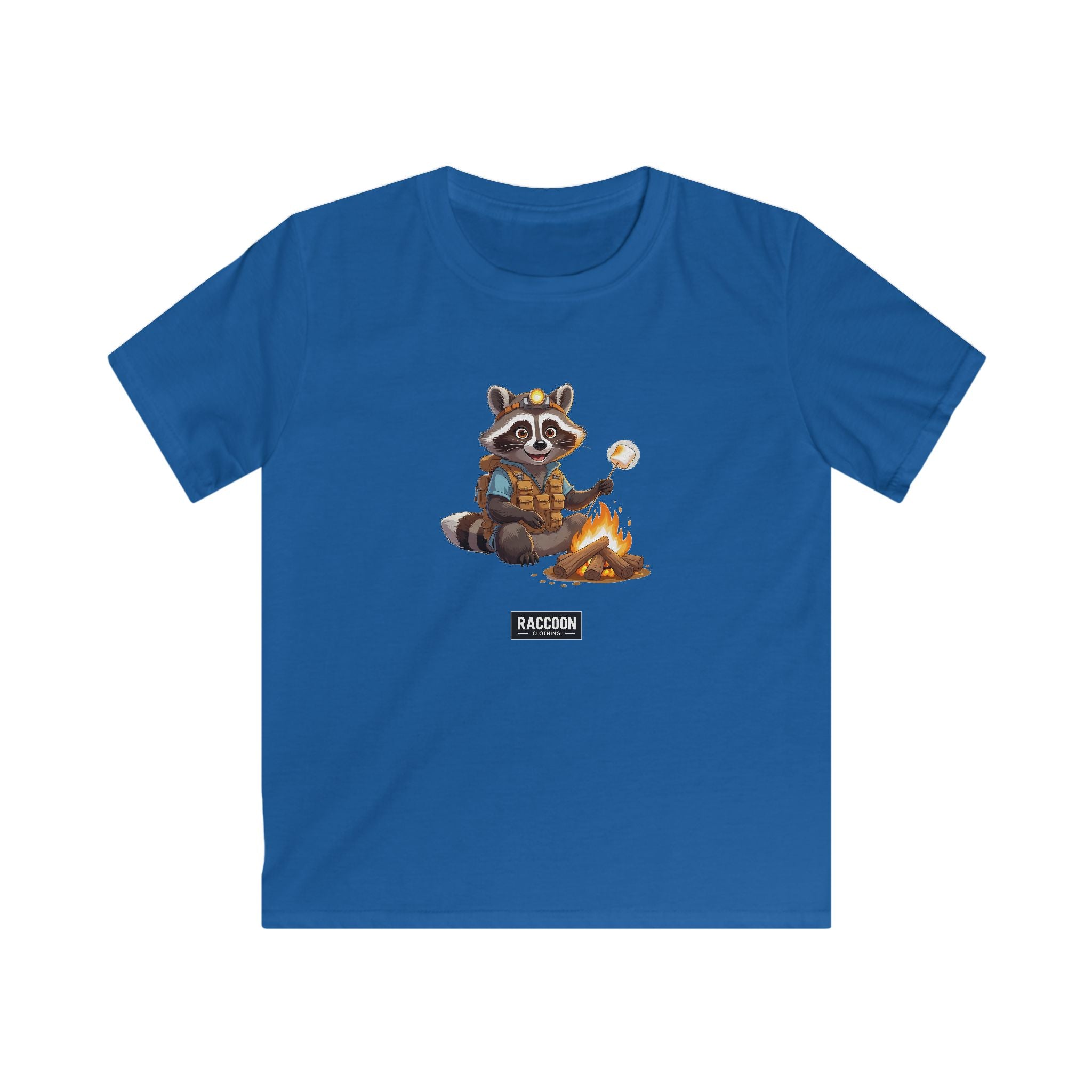 Abenteuerlust trifft Gemütlichkeit – das Pfadfinder Waschbär Kinder T-Shirt zeigt einen niedlichen Waschbären als Pfadfinder, der Marshmallows am Lagerfeuer röstet....